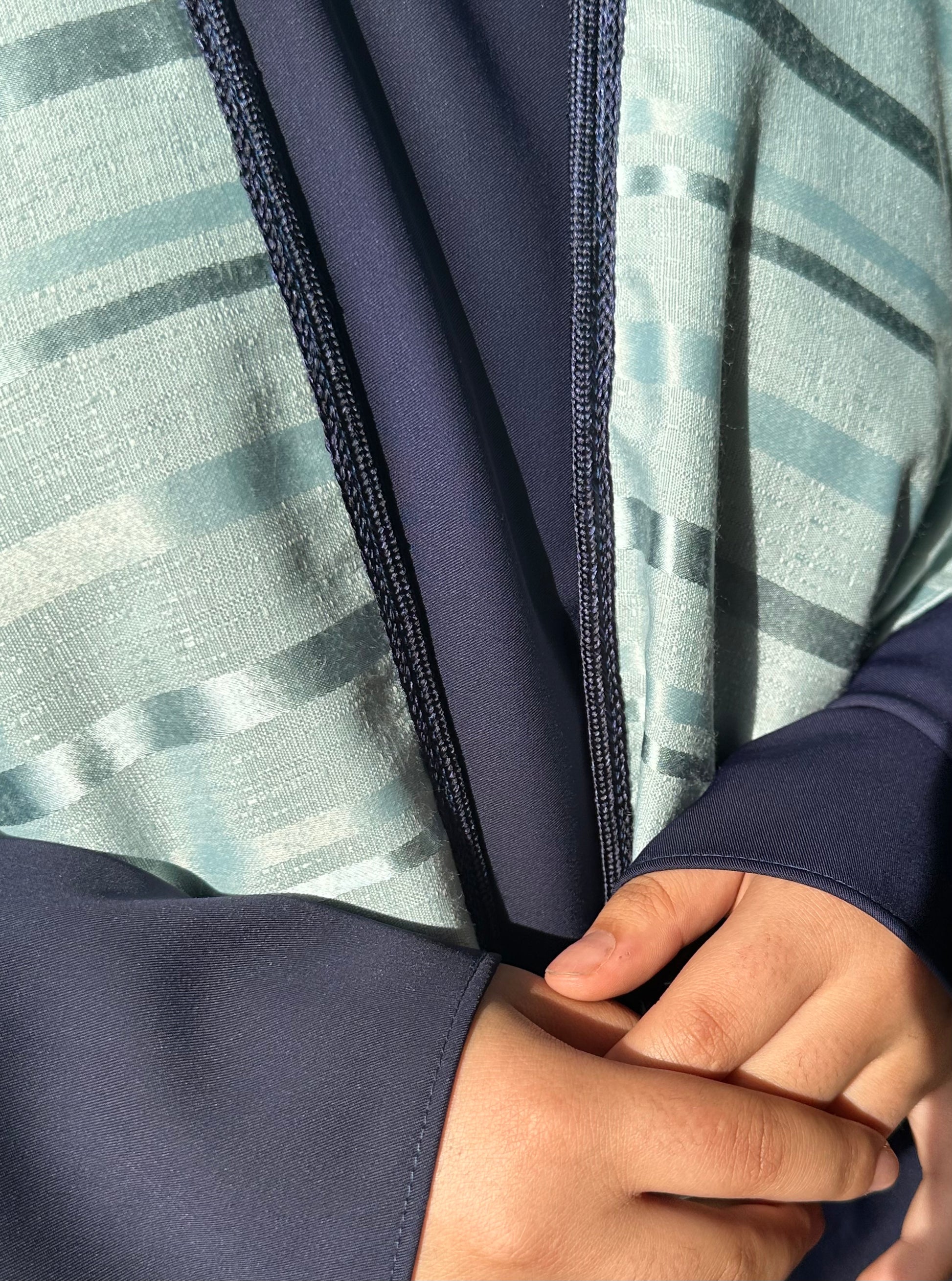 Voici le bleu qui est composé d'une abaya en crepe de soie bleu foncé d'une qualité premium vraiment ma gni fi que !